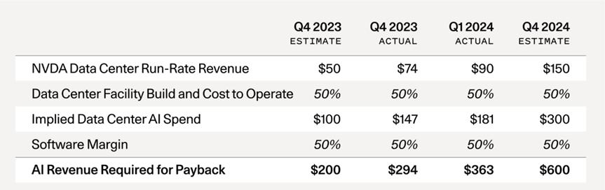你所要做的就是将 Nvidia 的运行率收入预测乘以 2 倍,以反映 AI 数据中心的总成本(GPU 占总拥有成本的一半,另一半包括能源、建筑物、备用发电机等)。然后你再乘以 2 倍,以反映 GPU 最终用户的 50% 毛利率(例如,从 Azure 或 AWS 或 GCP 购买 AI 计算的初创公司或企业,他们也需要赚钱)。