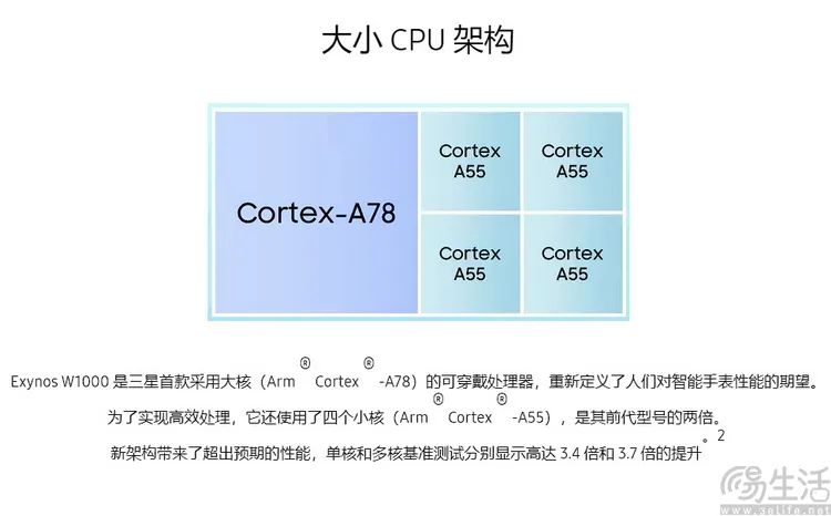在这样的先进工艺支撑下,Exynos W1000的性能参数也确实很“吓人”。它拥有当今智能手表SoC里首创的1*Cortex-A78+4*Cortex-A55五核CPU,并集成了Mali-G68MP2图形处理器。用三星方面的话来说,Exynos W1000的CPU单核与多核性能,分别达到了前代(Exynos W930)的3.4倍和3.7倍,提升堪称恐怖。