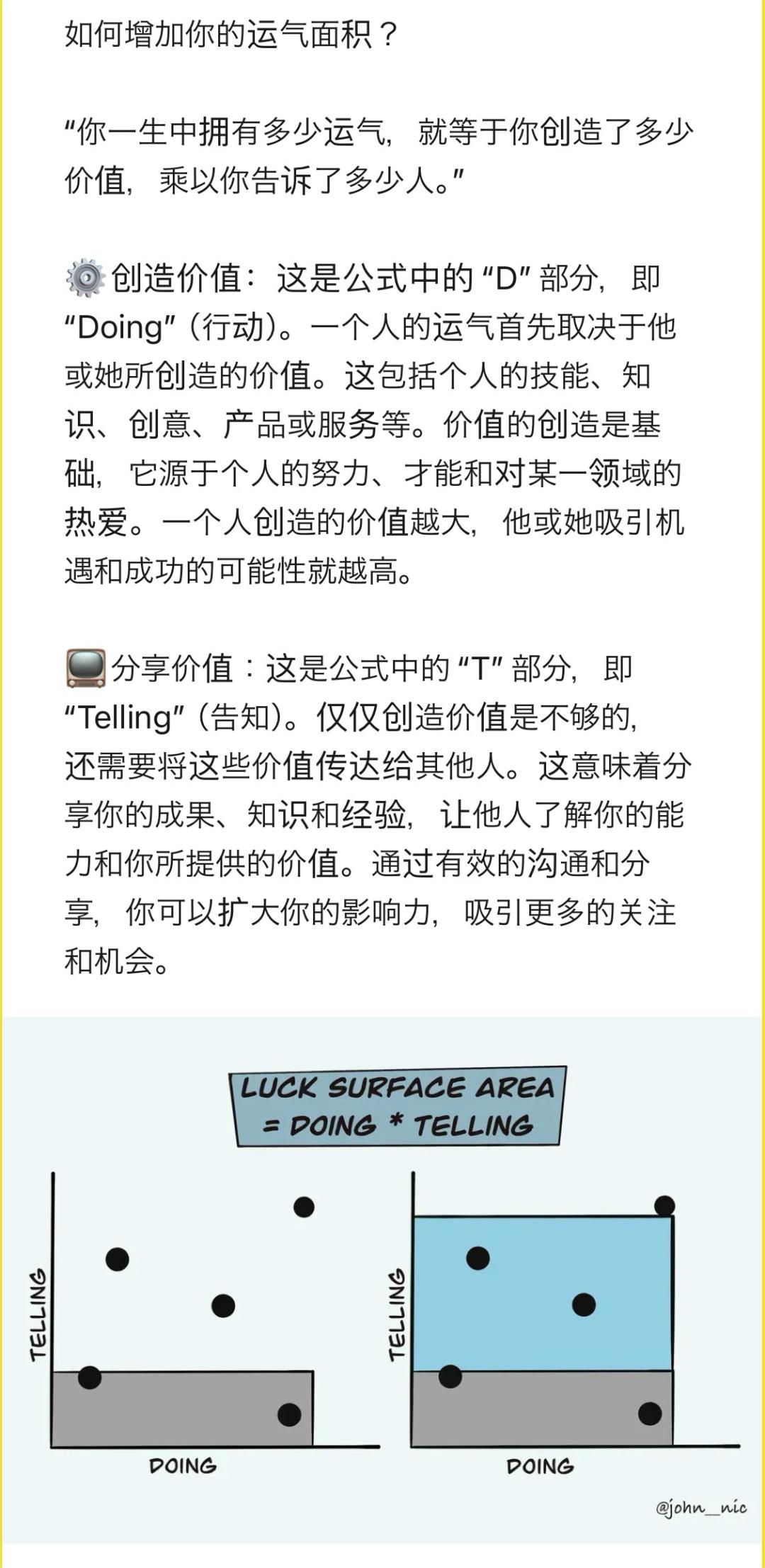 最近的一个新启发是“运气面积”,一个人的运气好,因为你的接触面更大,所以要做更多的事,尽可能被人知道,类似于很多独立开发者爱说的一句话:build in public(公开创造),所以我鼓励大家做自媒体,给运气一个机会嘛。