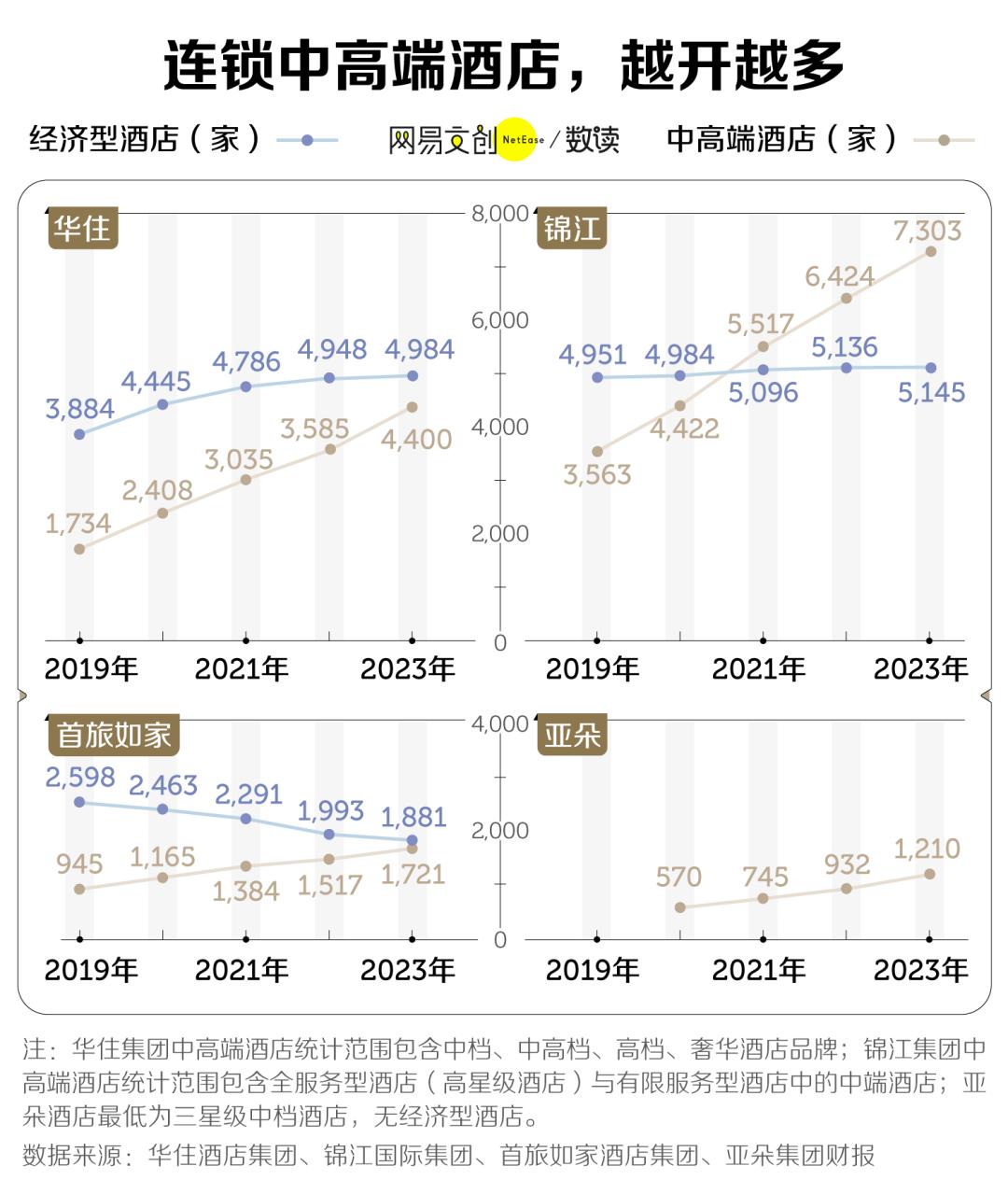 在这两年,酒店巨头们纷纷开始在中高档赛道发力,经济型酒店不断收缩,中高档酒店却越开越多。像锦江集团,早在 2021 年,旗下的中高端酒店数量就超过了经济型酒店,并且差距还在越拉越大。