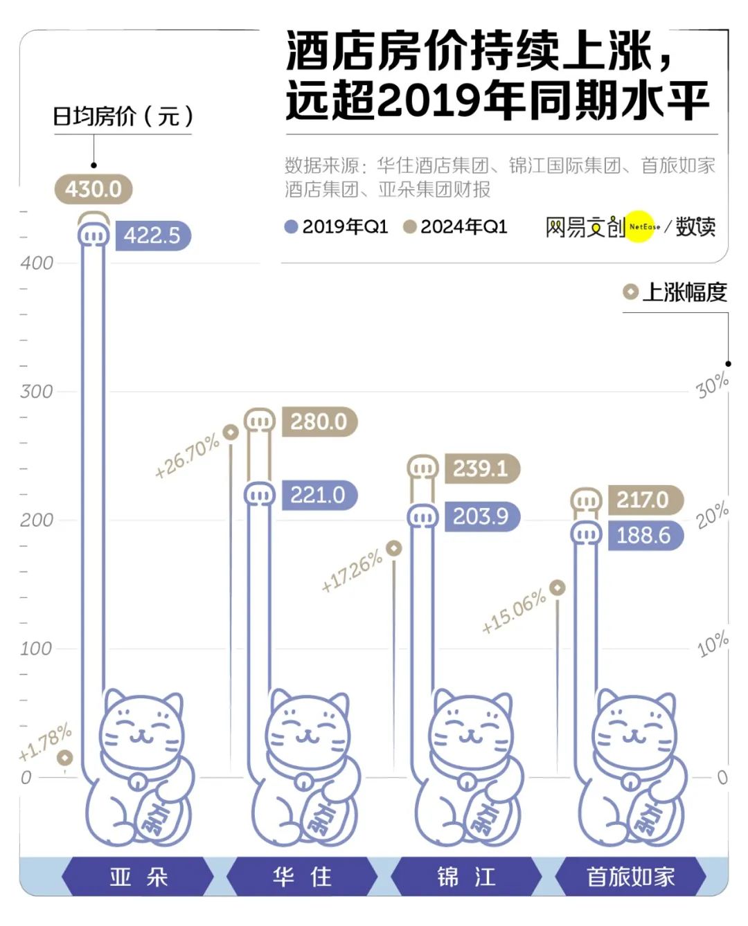 我们查阅了四大连锁酒店的财报,发现涨价最凶猛的当属旗下包含汉庭、全季等酒店的华住集团,从 2019 年一季度日均房价 221 元直接涨到了 2024 年的 280 元 [1][2]。