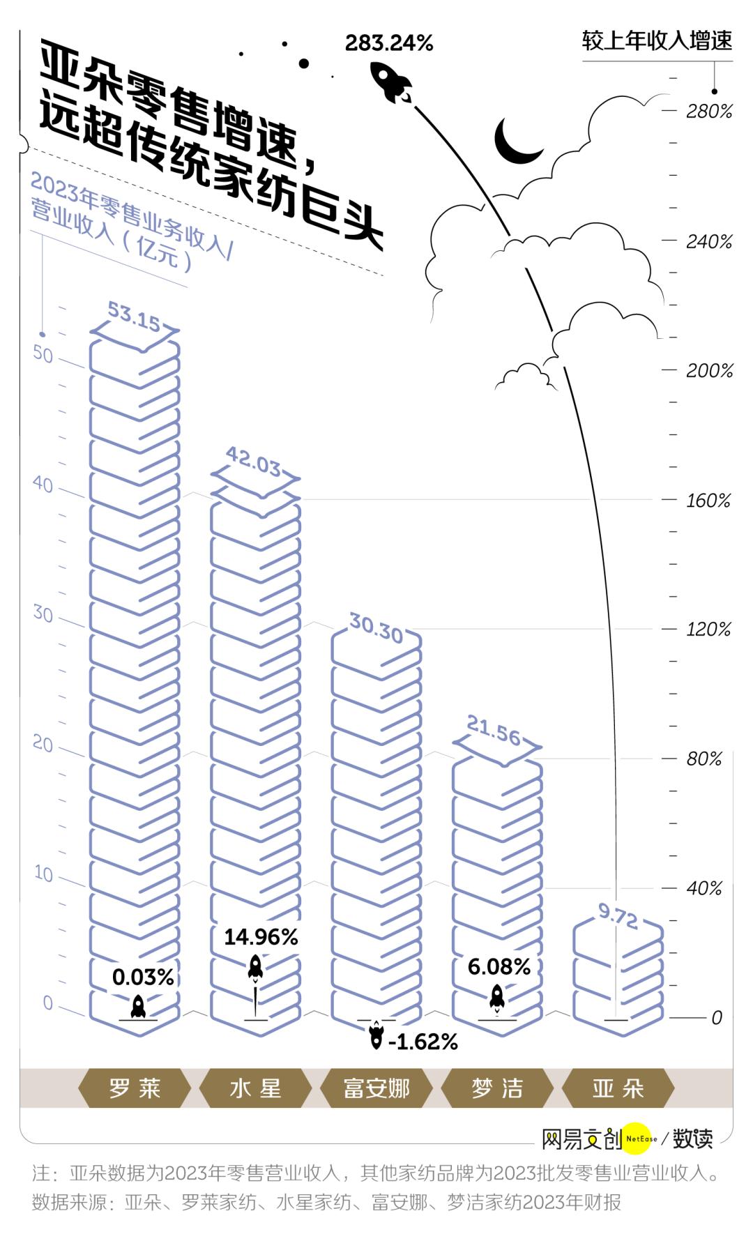 亚朵的突然入场,也搅浑了早已停滞不前的传统家纺市场。2023 年,罗莱家纺批发零售业务的营收增速甚至不到 0.1%,水星家纺的增速略亮眼,接近 15%,但放在亚朵 283.24% 的零售收入增速面前,一切都显得暗淡无光。