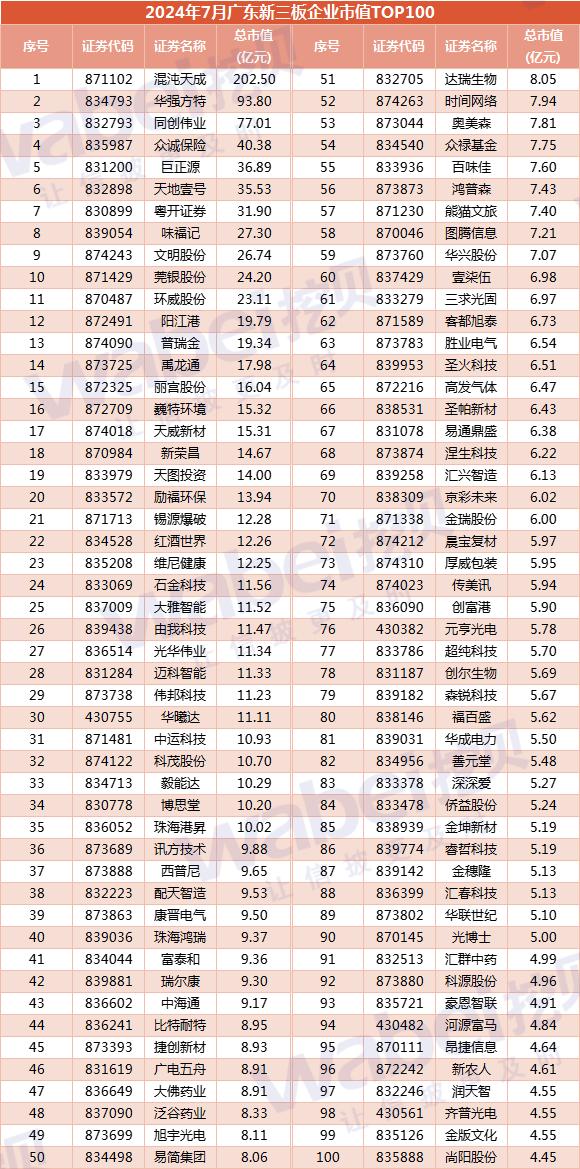 2024年7月广东新三板企业市值TOP100:27家企业正冲击北交所