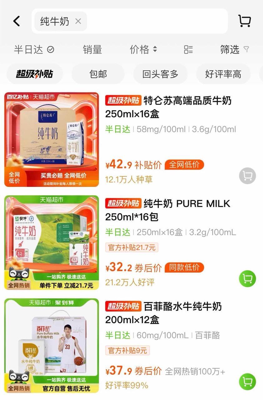 《天下网商》对比了天猫超市里,水牛奶与其他牛奶的价格差异,百菲酪200ml*12盒装售价37.9元,约为1.58元/100ml,特仑苏为1.07元/100ml,蒙牛纯牛奶则仅需0.8元/100ml,百菲酪比普通牛奶的价格贵了近两倍。