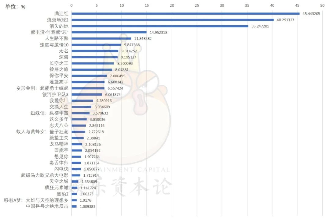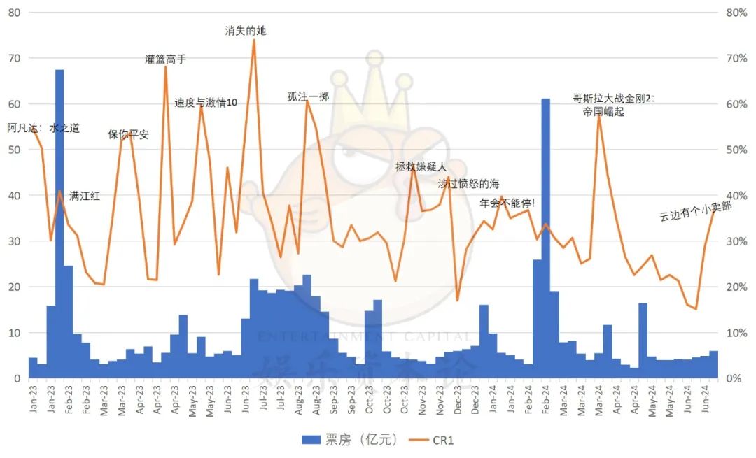 答案正如我们在前文中所提到的那样,2024年,非档期的黑马佳作变少了。从市场头部效应来看,非档期时间段头部效应的突然增加都对应一部非档期佳作,如去年的《保你平安》(7.0亿票房)、《拯救嫌疑人》(5.69亿票房)、《涉过愤怒的海》(5.49亿)等,而这些作品恰好正对应5亿-10亿的票房区间。而2024年上半年,头部影片市占率持续下滑,仅出现了《哥斯拉大战金刚2:帝国崛起》(9.56亿票房)一部在非档期市占率飙高的作品。