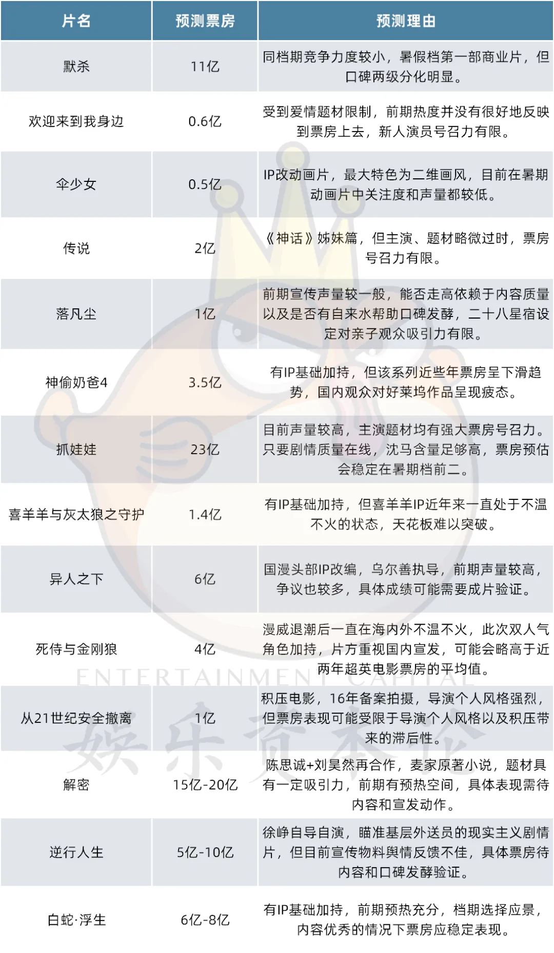根据娱乐资本论预测,就目前的市场反馈和影片布局来看,《抓娃娃》将领跑七月电影市场,而八月市场上由于定档影片较少,基本观影需求将由《解密》承接,成为八月电影市场带动者。