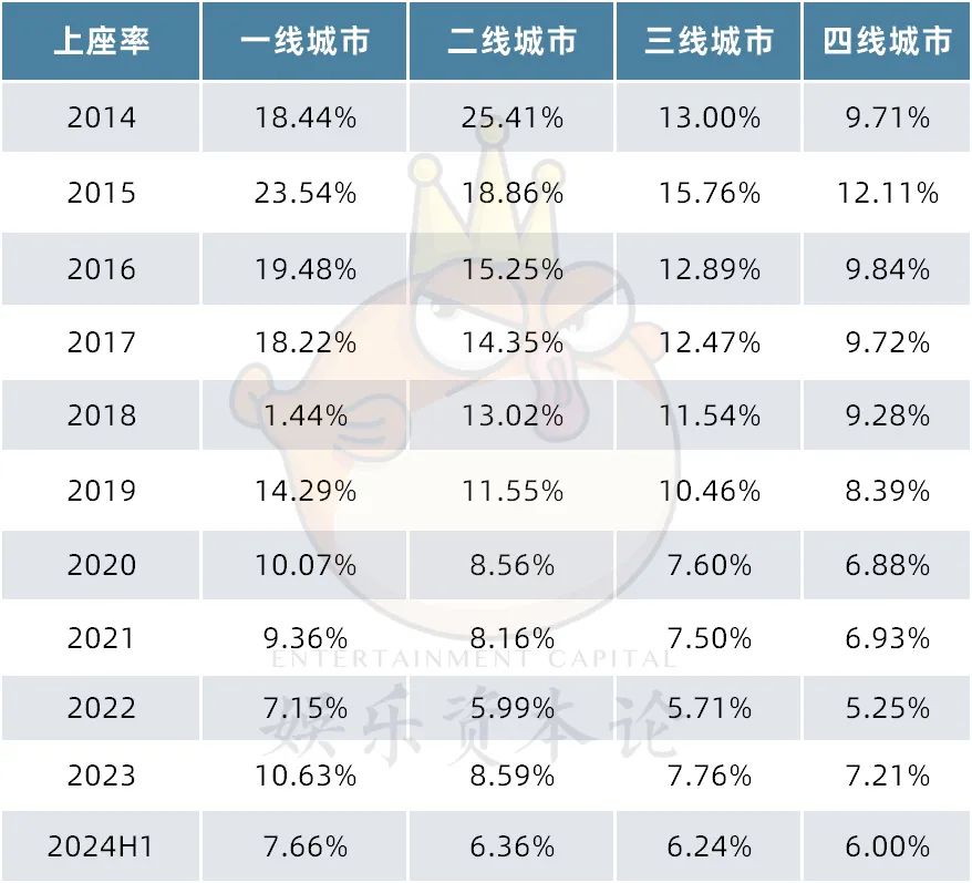 从上座率来看,一线城市2024年上半年的上座率下滑近3%,远高于二、三、四线城市。一线城市观众在情节、思想、叙事等方面都对电影有着更加严格的要求。随着下沉市场的观影习惯逐渐稳固,用铺张影院获取下沉市场增量的方式不再奏效,电影市场仍需尽早回到用质量打动观众的道路上来。