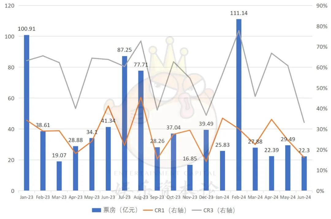 2023-2024年月度票房情况 数据来源:灯塔专业版