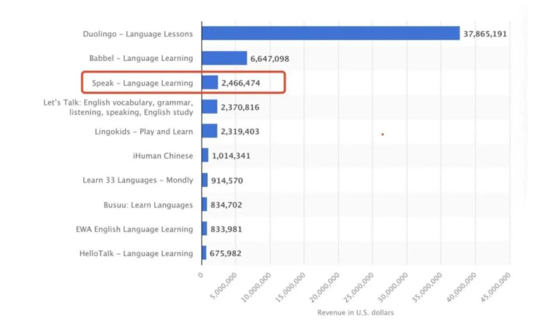 根据Statista数据,如果算上网页端收入,Speak的收入已经能够排在同类产品的第三位,仅次于Duolingo,Babbel。甚至在Speak主攻的韩国市场,其收入已经超过Duolingo了。