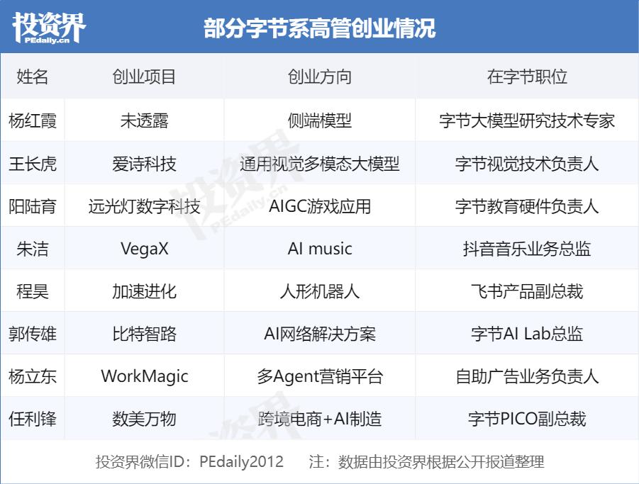 其中,字节系尤为突出。今年以来,字节高管投身创业的消息不绝于耳——除了杨红霞、王长虎、阳陆育、张月光、郭传雄、程昊.....不约而同地,他们都选择AI赛道,吸引了一众VC的目光。
