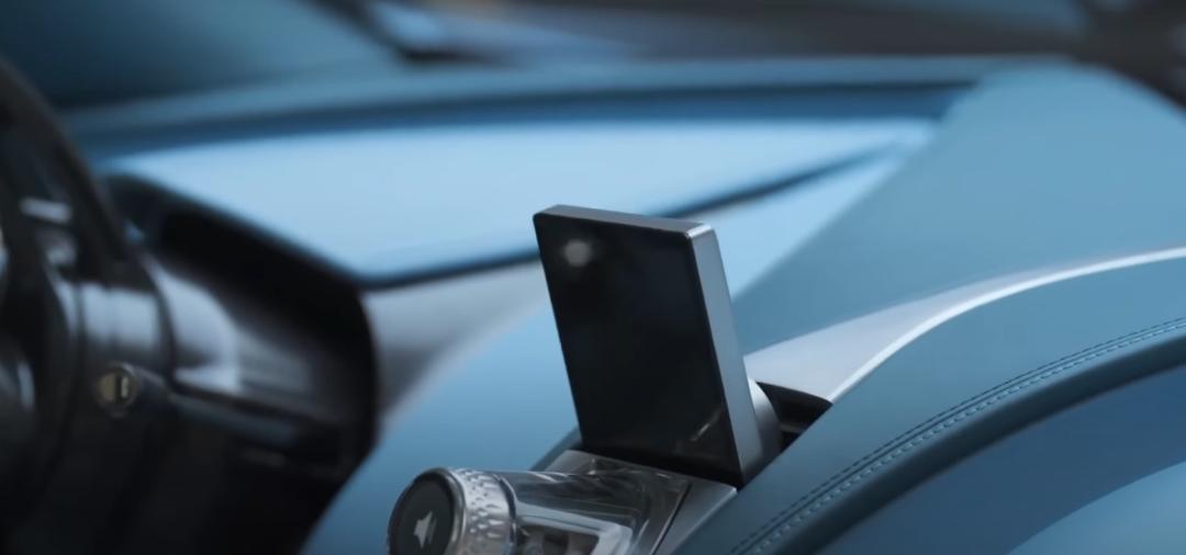 最搞笑的一点是,马特自己明明是电车出身,但是非常讨厌现在满车的大屏幕,他觉得这种设计是非常容易过时的。所以在 Tourbillon 的车里,他只放了一块这么小的伸缩屏幕用来看倒车影像和 Carplay 。