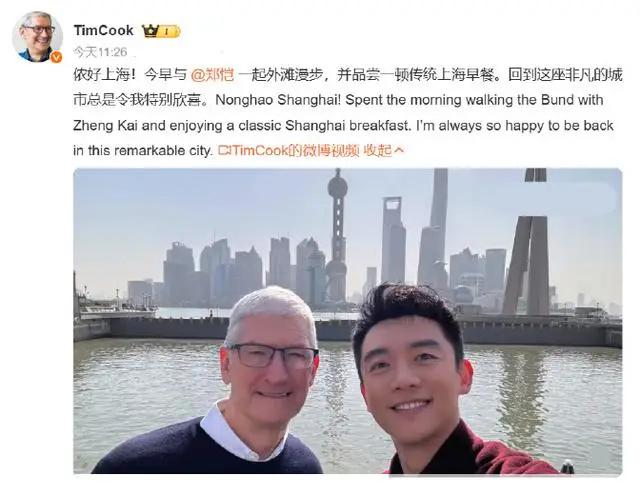 而且郑恺发完后,库克随后也发了动态,内容和郑恺的差不多,只是少了偶遇这个词,多了对上海的赞美,如果是偶遇,库克会为此发个动态吗?显然不会,所以两人的“偶遇”是他们团队促成,库克心里装的是生意,郑恺可能想给苹果代言,不过大家显然不看好这个组合。