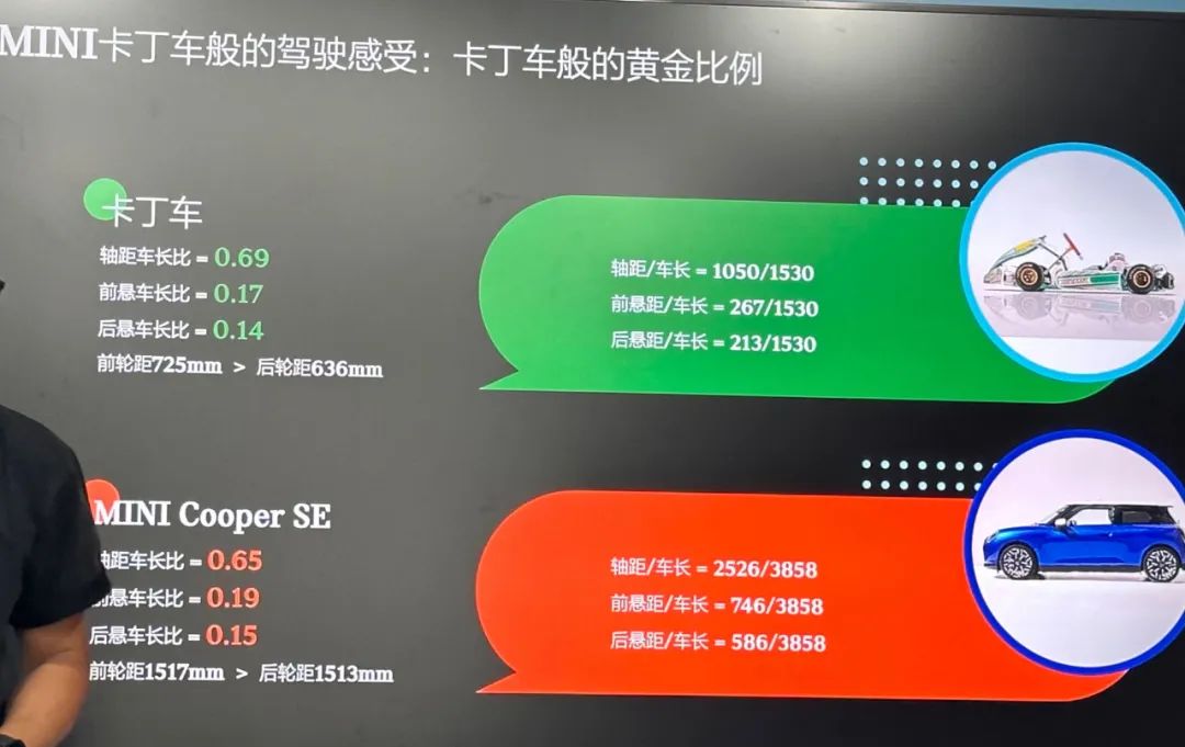 而MINI Cooper 的数据,分别为0.65、0.19以及0.15,其车身的各项长度比,和卡丁车的设计相差无几。