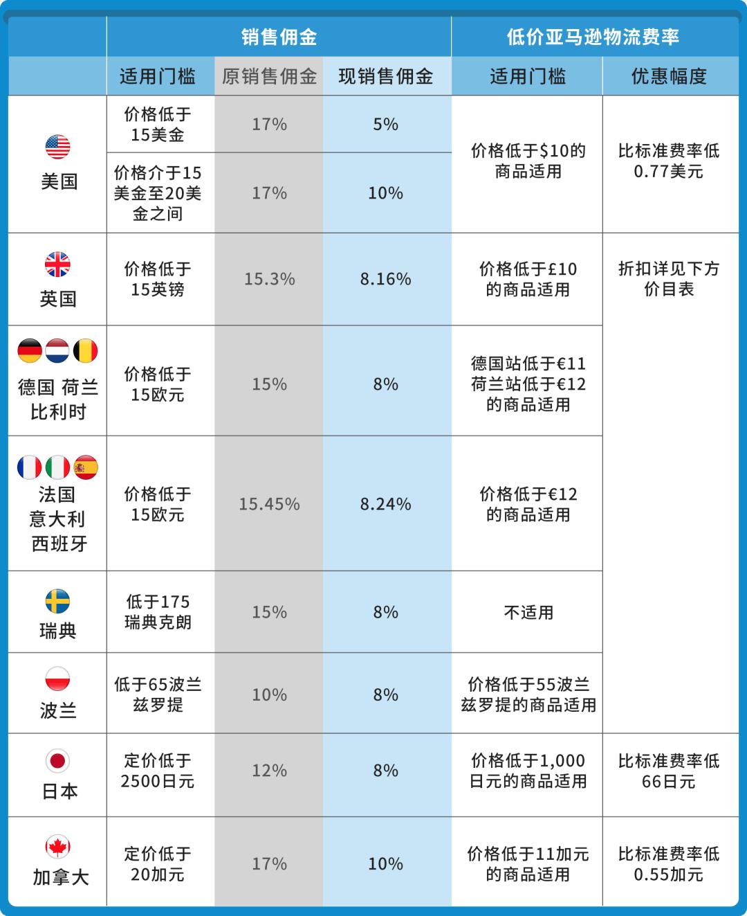 自今年5月15日起,亚马逊在欧洲、日本和加拿大站,为低价服装商品的销售佣金提供折扣。不同地区的降幅调整不同,在加拿大站,原亚马逊定价低于20加元的服装商品销售佣金为17%,调整后降到了10%。根据亚马逊官方发布的信息,2024年1月份,亚马逊在美国站下调低价服装品类商品佣金比例后,效果收到较好反馈。