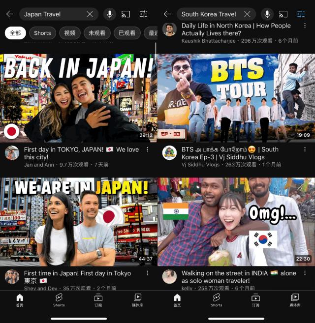 在YouTube上以“Japan Travel”“South Korea Travel”为关键词搜索,会发现外国游客对于日本的记录多在于日常生活的小细节,以及对日本城市整体面貌的展现,记录多过表达;而韩国出来的相关结果则与K-POP紧密挂钩,动辄百万播放的视频下方是来自全球各地网友“想来韩国见偶像”的留言。