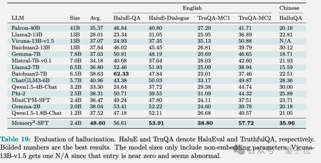 在幻觉评估上,Memory3避免了将文本压缩到模型参数中可能会导致的信息丢失,表现的比大部分模型要好。