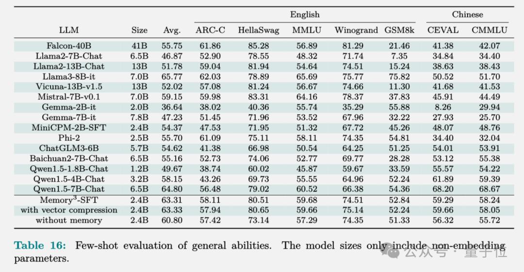 最终训练出来的Memory3模型,在HuggingFace排行榜上的评测结果如下,显式记忆将平均分数提高了2.51%。