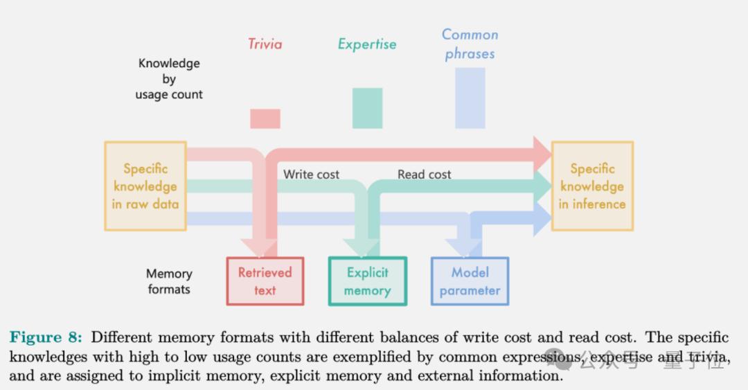 结果发现,把常用知识塞进模型参数里成本最低,但容量有限;不常用的知识直接检索效率最高,但每次读取都要重新编码,成本高;而显式记忆则是个平衡点,对于使用次数中等的大部分知识最划算。