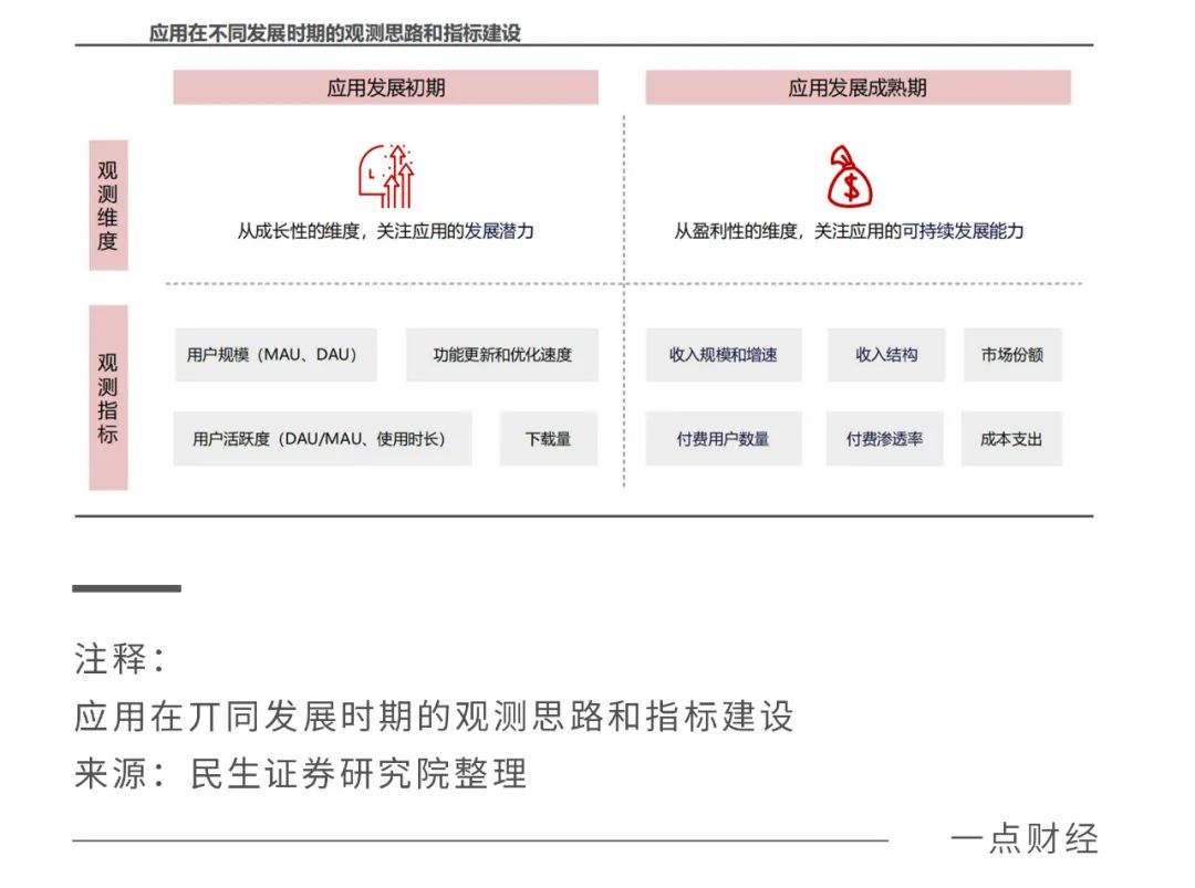 民生证券在研报中指出,当新应用上线时,市场应从成长性的维度出发,观测用户规模和活跃度、下载量、产品迭代等指标,关注应用的发展潜力,弱化对付费用户规模、付费渗透率等营利性指标的考虑。