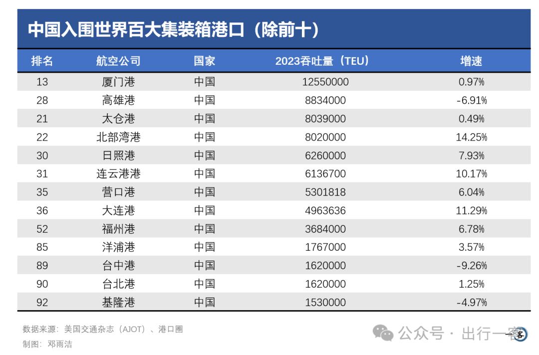 此外,百大集装箱港口中,中国港口还有厦门港、高雄港、太仓港、北部湾港、日照港、连云港港、营口港、大连港、福州港、洋浦港、台中港、台北港、基隆港港口。