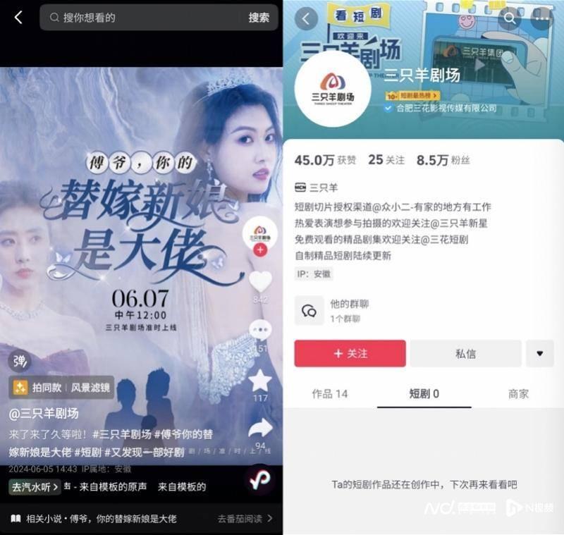 6月6日,小杨哥的公司“三只羊网络”推出首部竖屏付费短剧《傅爷你的替嫁新娘是大佬》,全集42元;谦寻文化则成立了谦萌文化,近期,谦萌文化三部短剧《替身男友》《我家来了男保姆》《别跟弟弟谈恋爱》的海报亮相。遥望科技在2023年四季度,将短剧平台以微信小程序的方式上线。