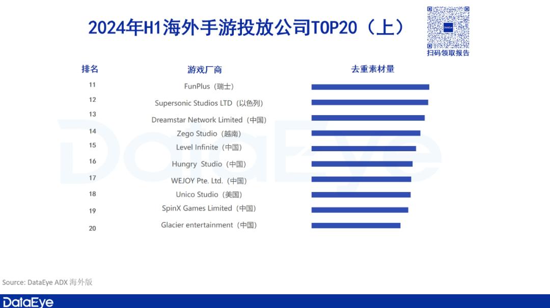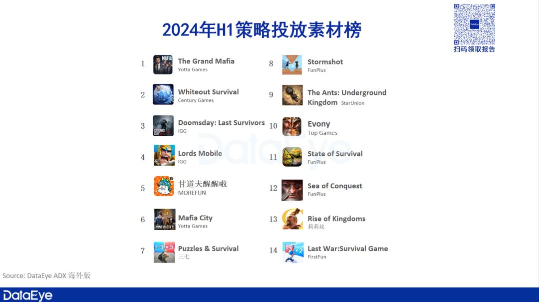 在2024年H1海外策略手游投放榜TOP14上,来自中国的厂商占据了所有席位。