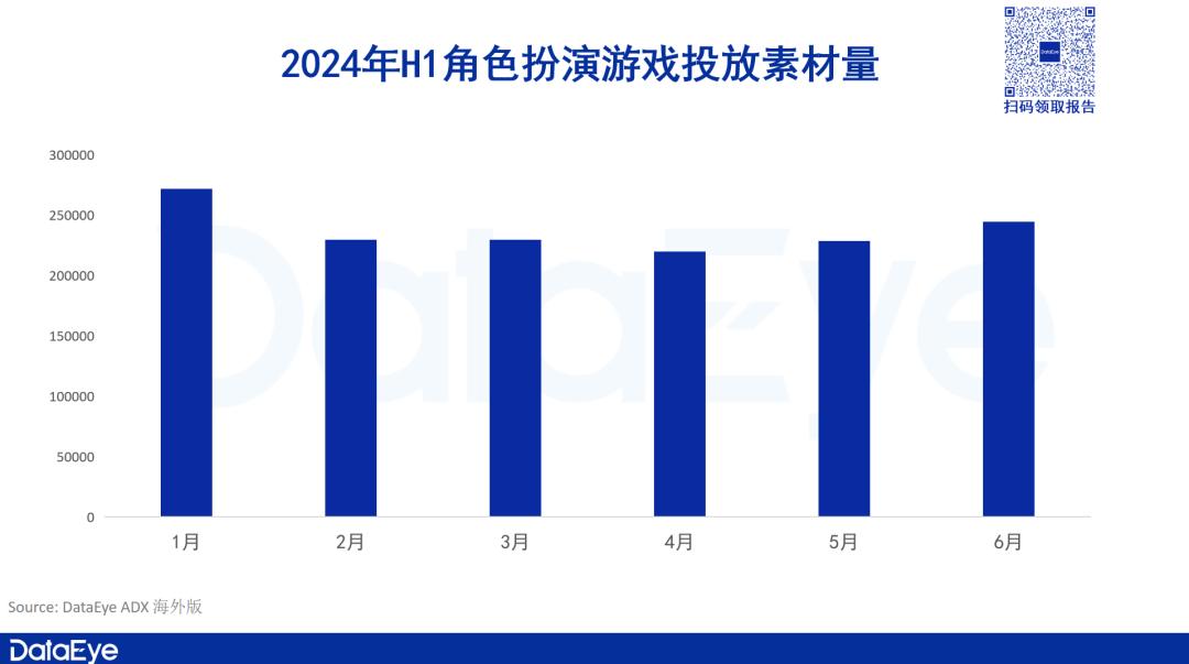 2024年H1,角色扮演手游的素材投放量整体趋于平稳,一月和六月是投放的高峰期,月均投放数超过23万。