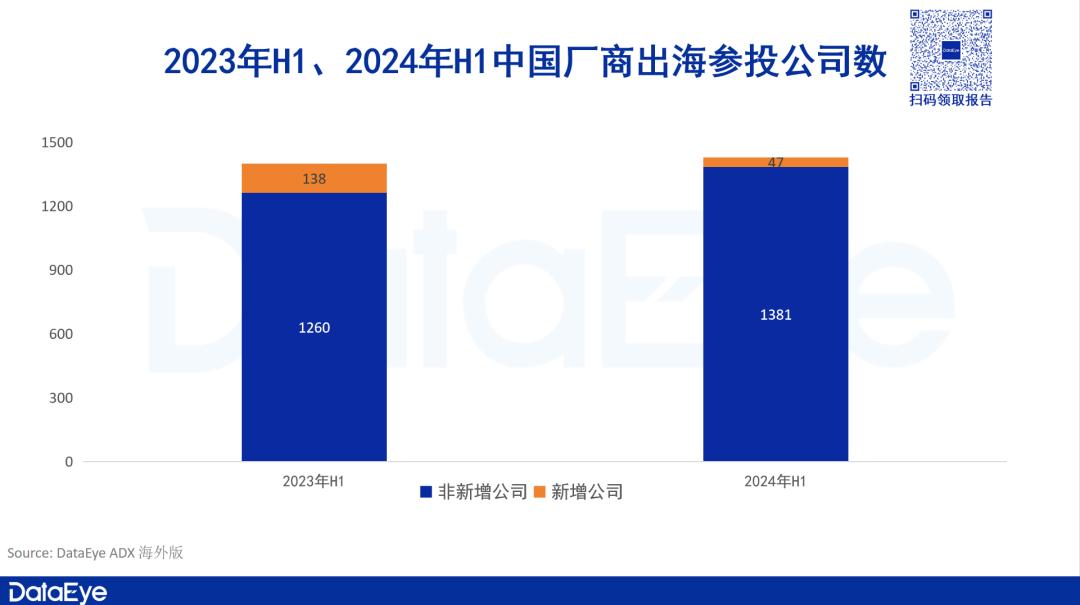 ADX海外版显示,2024年H1中国大陆出海参投的厂商数量总共超过了1400家,同比基本持平。
