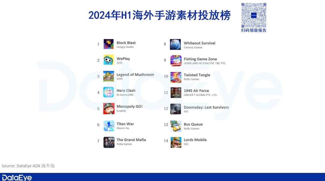 H1的海外买量素材TOP3游戏是《Block Blast》《WePay》和《菇勇者传说》,榜单上共有9家中国厂商入围,其中只有IGG以《Doomsday: Last Survivors》和《王国纪元》入围两次。