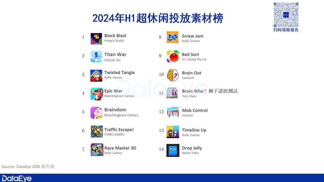 Hungry Studio的《Block Blast》和冰川网络的《Titan War》分列一二名,剩余上榜次数最多的是土耳其的Rollic Games(4次)和英国的Matchingham Games(2次)。