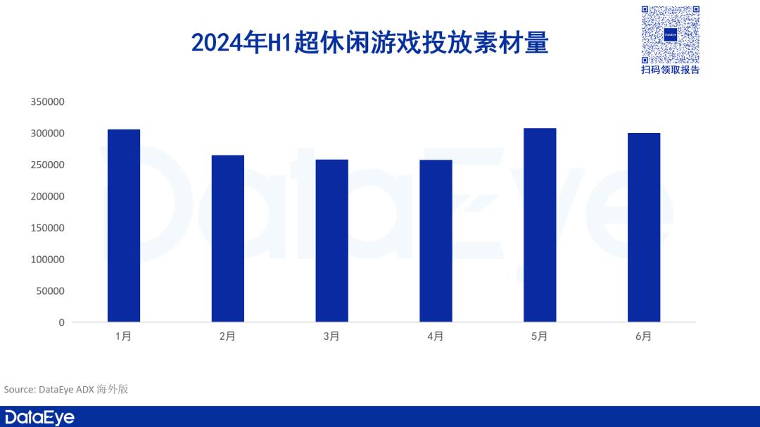 2024年H1,超休闲手游的广告量投放呈现出先缓降后急升的走势,五月份投放素材量激增,超过了30万,回到了一月份的高水平,也创下上半年的新高。