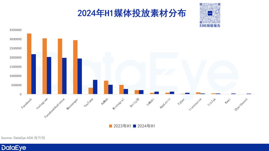 在投放素材量的媒体分布上,处于头部的Facebook、Instagram、FacebookAudience、Messenger均出现了下滑,目前平均处于200万的素材量。