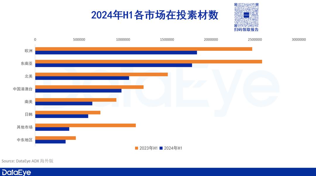 2024年H1,欧洲、东南亚、中国港澳台包揽出海手游素材投放前三,三大市场合计占据约63%的投放量。北美和日韩紧随其后。