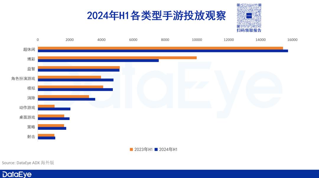 从投放素材数的品类来看,2024年H1在投手游数量占比TOP3为超休闲、角色扮演类和博彩类,这三个品类的投放素材数量就占了总数的54%。