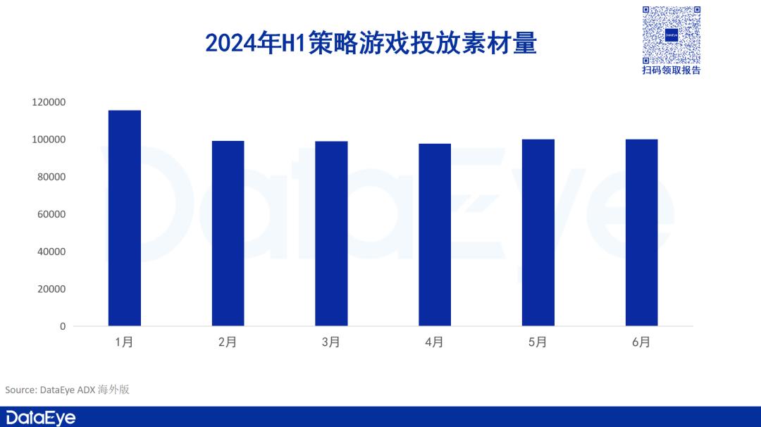 2024年H1,策略手游的广告量投放整体呈平稳趋势,1月为投放素材量最高月份。