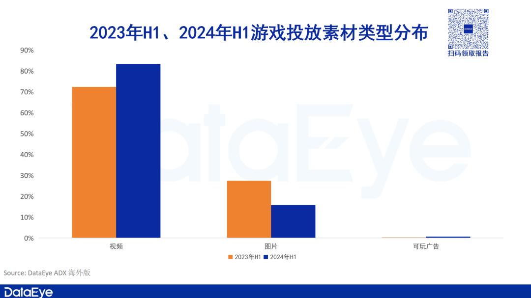 2024年H1在海外手游投放的素材中,视频类的占比同比进一步提升,已经达到83%,而图片类素材减少到了16%。
