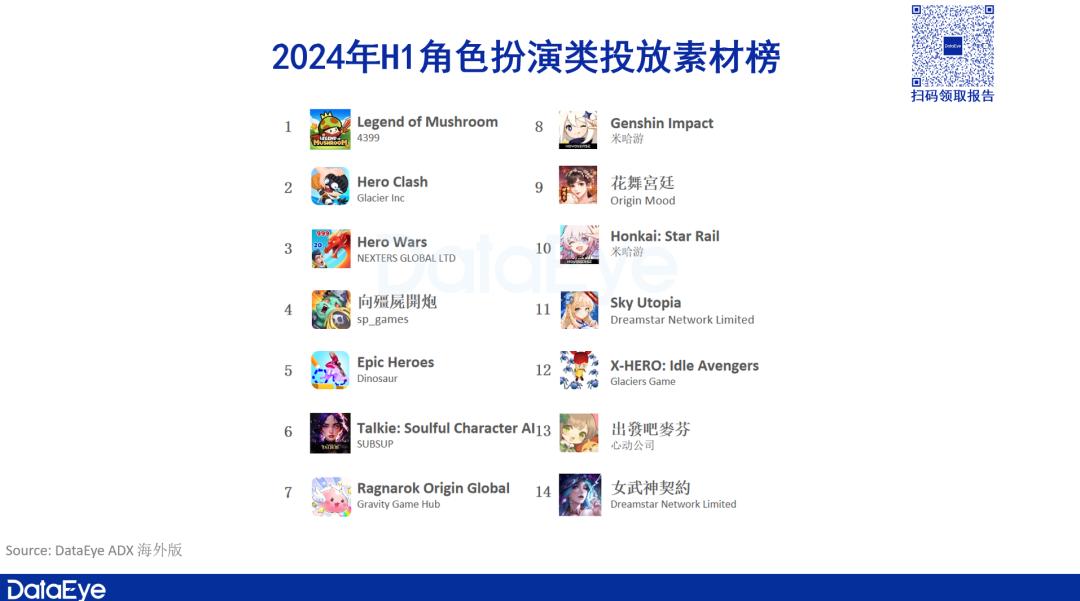 在角色扮演类手游的素材投放榜上,中国游戏厂商依旧保持着绝对的领先。在TOP 14中占据了10个席位。