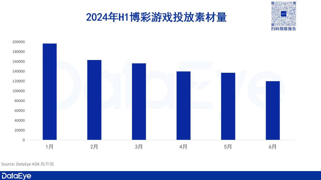 2024年H1的博彩手游的广告量投放延续了2023年Q4下滑的趋势,呈现出每月逐步下滑的趋势。在6月份时,博彩手游的广告投放量相比1月份已经下滑了40%。