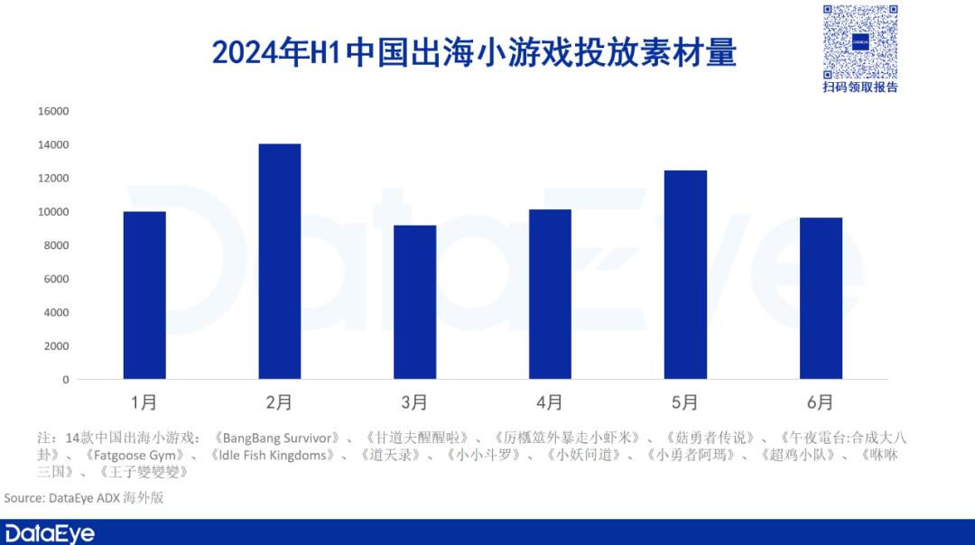 在2024年H1,14款典型的小游戏化身APP出海,总共投放素材量达到了65360(视频+图片),平均每月有10893的素材投放。