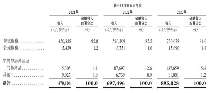 其中,医疗服务是同仁堂医养最核心的收入来源。2021-2023年,同仁堂医养分别实现收入4.70亿元、6.97亿元、8.95亿元,来自医疗服务的收入分别为4.50亿元、5.96亿元、7.31亿元,占同年总收入的95.8%、85.5%、81.6%。