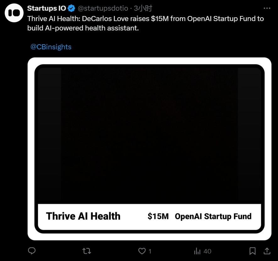 X平台投资自媒体Startups IO发文称,Thrive AI Health从OpenAI创业基金筹集了1500万美元,目前Thrive AI Health官方并未公布具体的融资金额。