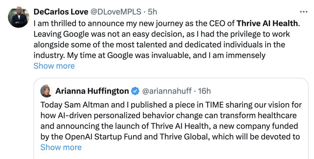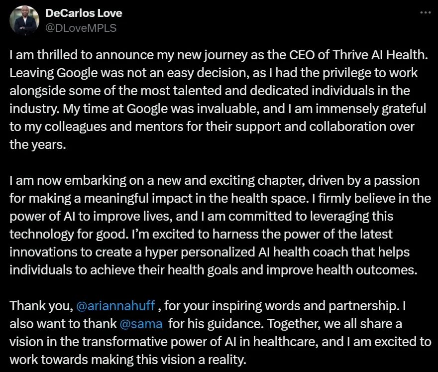 在加入谷歌之前,洛夫还曾在苹果和Athos担任产品职务。洛夫在X平台上发文公布了自己将上任Thrive AI Health CEO的消息。