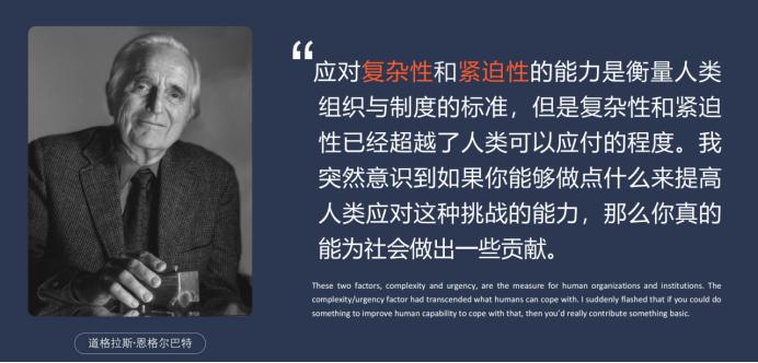 回顾一下机器的概念,在这里我引用了微软董事长兼 CEO 萨提亚·纳德拉经常引用的来自道格拉斯·恩格尔巴特的观点。道格拉斯·恩格尔巴特是当代计算机文明的奠定者之一,他的技术愿景和对于人类社会发展的洞察仍然指导着当前计算机器的发展方向。恩格尔巴特持有与范内瓦·布什和司马贺这些思想家相似的观点,都认为人类社会接下来最大的挑战就是因为信息过载而造成的复杂度已经远远超出了人类所能够处理的范畴,信息技术提升了人类社会效率,也加大了复杂度,我们需要计算机器帮助我们处理因为计算机器所带来的问题。