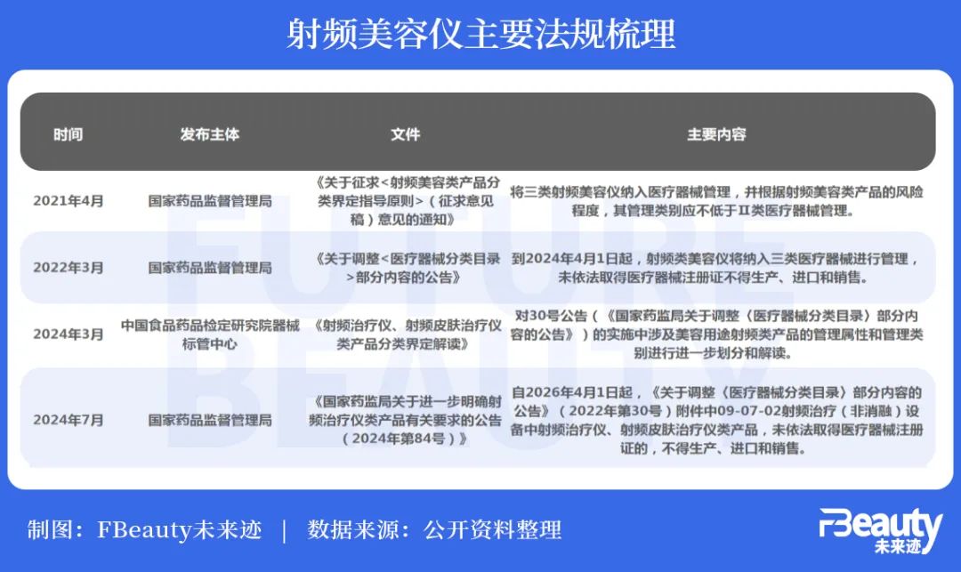 回顾射频美容仪相关法规的出台历史,从2021年4月国家药监局发布的《关于征求<射频美容类产品分类界定指导原则>(征求意见稿)意见的通知》中,指出三类射频美容仪纳入医疗器械管理,并根据射频美容类产品的风险程度,其管理类别应不低于Ⅱ类医疗器械管理。透露出射频美容仪将被纳入医疗器械管理的趋势。