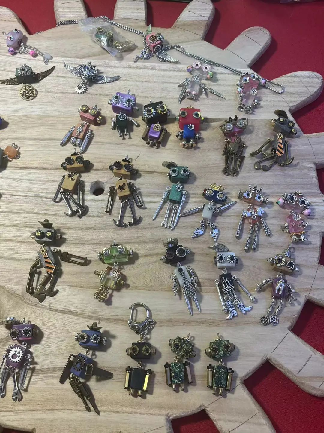 在特色各异的谷子摊、捏捏摊、调酒摊中,有一个摊位被包围得里三层外三层,挤进人墙,Morketing看到一个小姐姐在卖机器人手作挂件,如图所示,这些小玩意是用木头、石头做身体和头, 搭配上各种金属配饰,组成一个小机器人的样子,很是灵动。