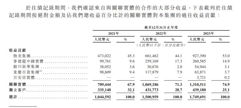 招股书上显示,2021-2023年期间,“物美系”客户产生的收益分别为7.09亿元、10.69亿元和13.1亿元,分别占多点数智总收益的67.9%、71.3%及74.9%。其中,公司最大客户物美集团直接贡献了4.73亿元、6.61亿元、9.27亿元的收益,占比高达45.3%、44.1%及53%。