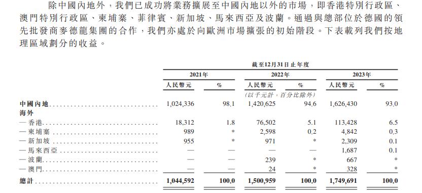 来自除中国内地以外市场的贡献的营收由2021年的2030万元增加至2023年的1.23亿元,同年在总营收的占比从2021年占比由1.9%上涨至7%。其中中国香港表现突出,2021年至2023年三年贡献的收入分别为1831.2万元、7650.2万元和1.13亿元。同年在总营收的占比为1.8%、5.1%和6.5%。