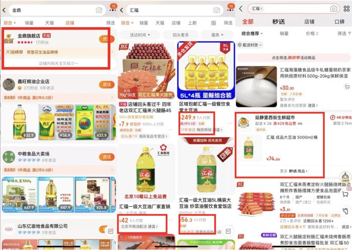 当前淘宝上仅有数家小店仍在售汇福的大豆油,销量仅在个位数,京东“小时达”中也有地方超市仍在售卖相关产品。