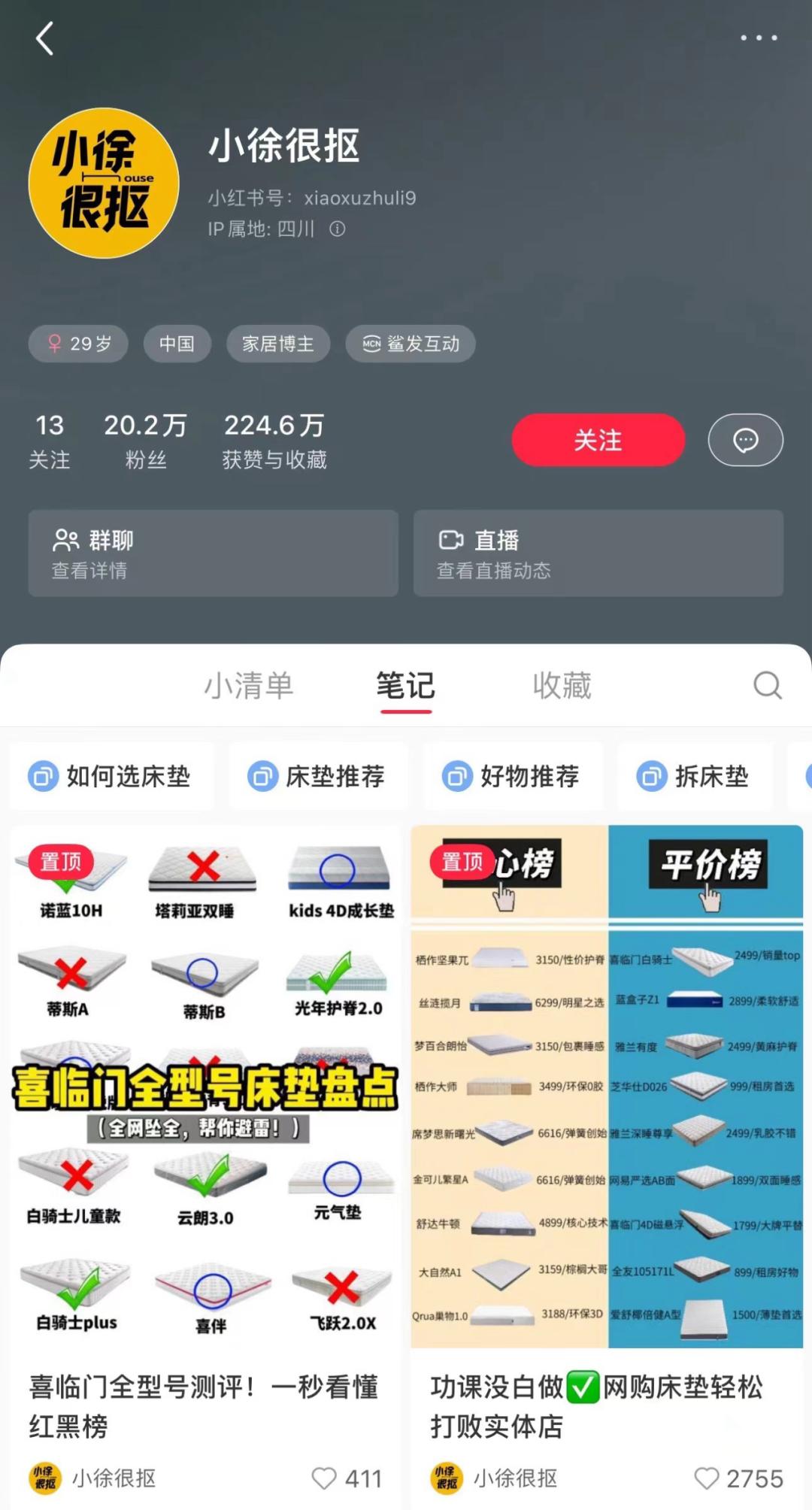 鲨发传媒旗下的200多位达人,在家居垂类中又进一步细分,比如达人「小徐很抠」就是主要以睡眠产品、软体家具为主,床垫、枕头、沙发等,她也是目前床垫这个细分类目中粉丝量最多的达人,「去年小徐很抠这个账号床垫单品的销售额就有2000万,今年预估会超过5000万GMV。」