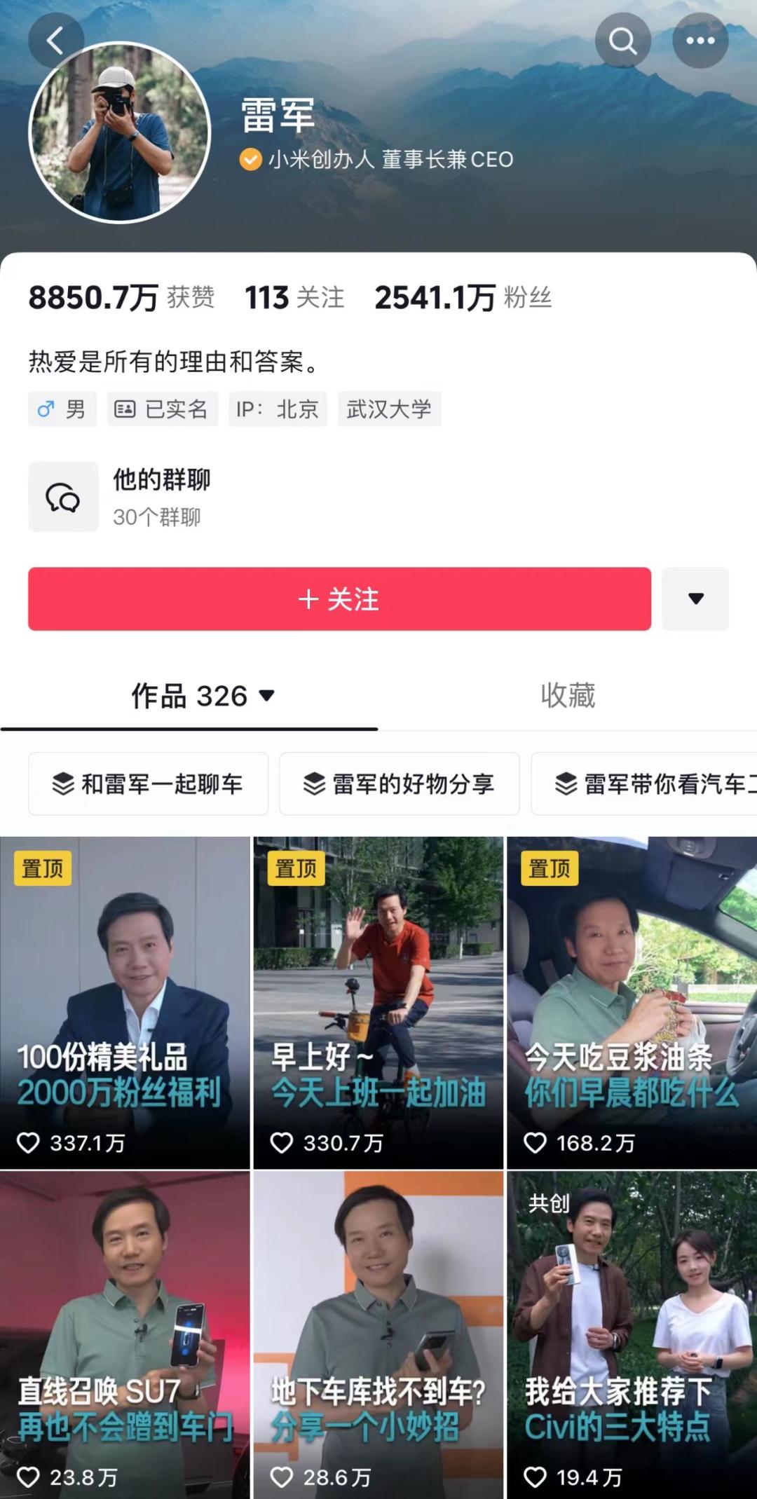 小米首车小米SU7上市后,创始人雷军带领小米集团合伙人、总裁卢伟冰、小米中国区市场部副总经理、Redmi品牌总经理王腾等「高管天团」入驻抖音。此后一批车企大佬开始纷纷在短视频上整活,周鸿祎和哪吒汽车CEO张勇共同驾驶哪吒L直播、蔚来CEO李斌直播自驾从法国去荷兰。
